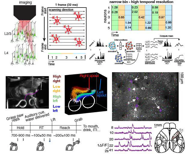 We invite qualified applicants for one of two open postdoc positions on our highly collaborative team studying the neural population dynamics underlying communication between sensorimotor cortices. One postdoctoral fellow will perform two-photon imaging experiments in mice performing reaching tasks (Prof. Matthew Kaufman’s lab, U Chicago, Chicago), and the second fellow will perform computational analyses and AI methods development using the collected data (SNEL, Emory U, Atlanta). This project will build upon our previous collaborative efforts to uncover latent dynamics from large neural populations using 2P imaging (RADICaL; Zhu… Kaufman*, Pandarinath*, Nature Neuroscience 2022). The experiments will use a Diesel2p to image activity from multiple areas simultaneously, and the computational component will extend RADICaL to infer dynamics and communication from these multiple areas.